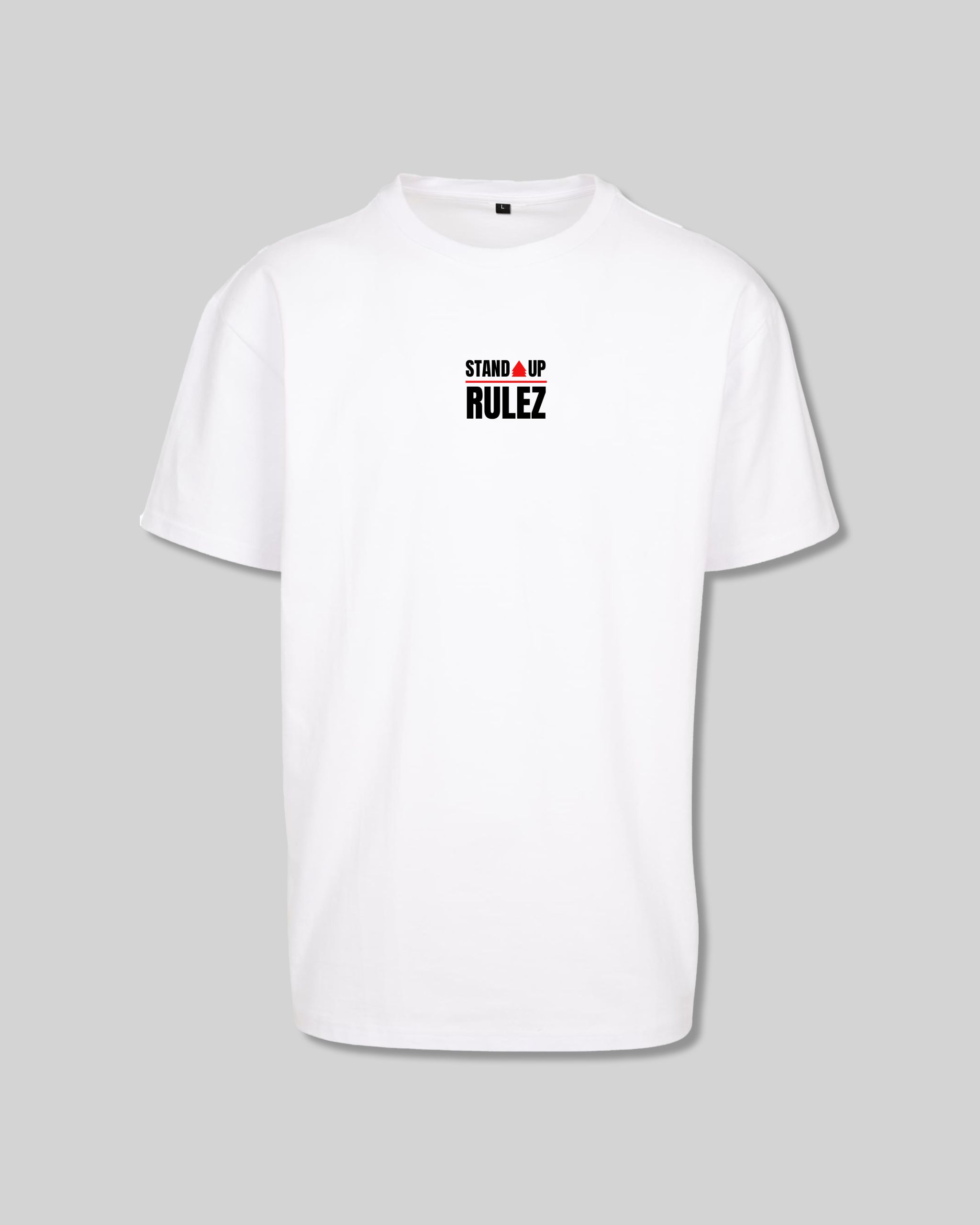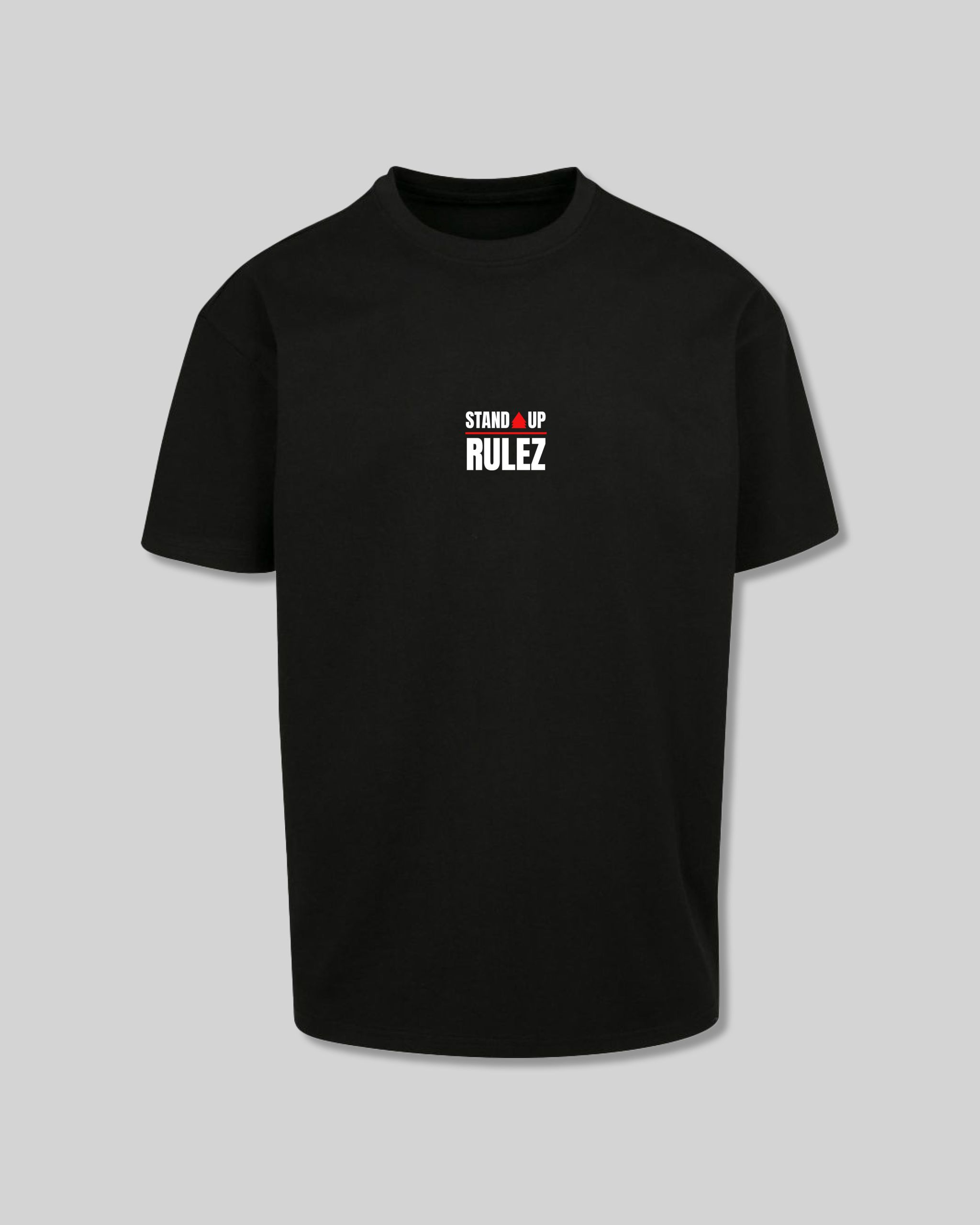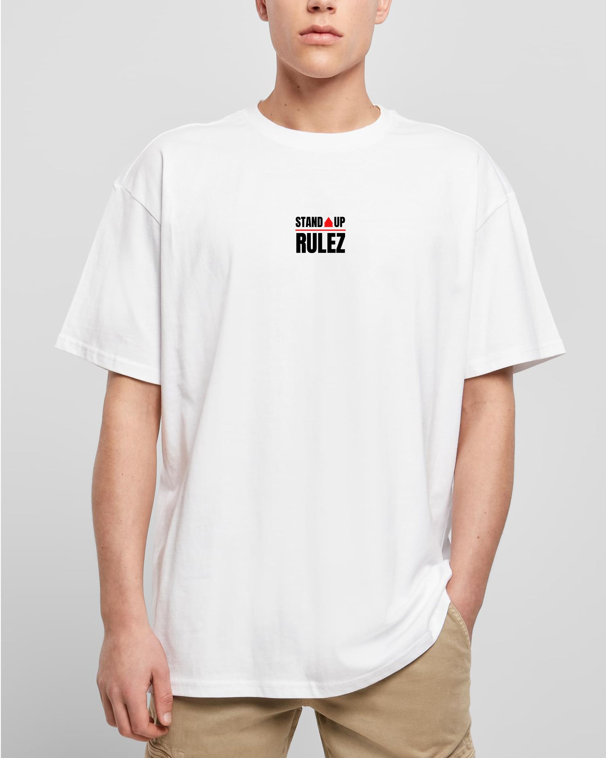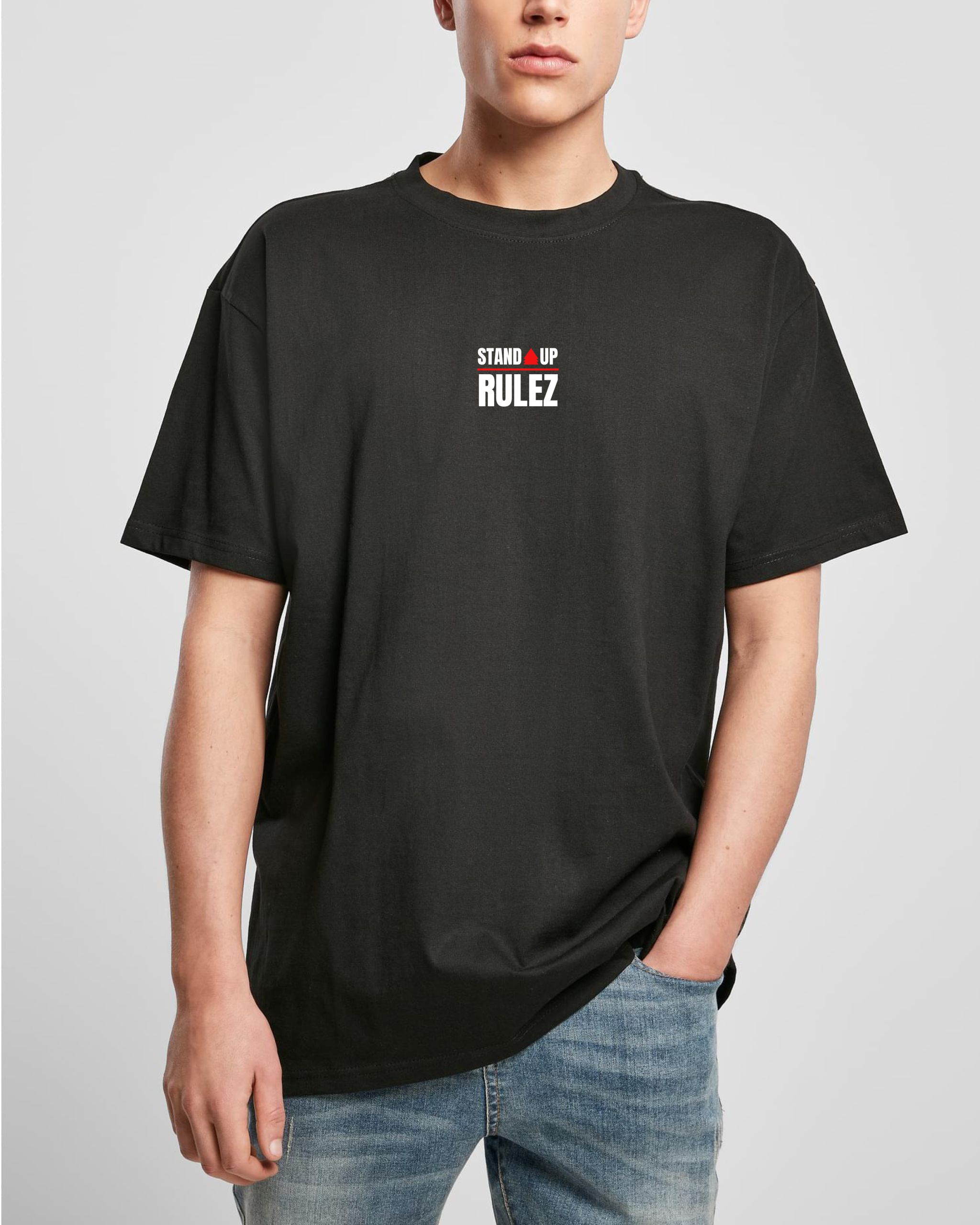 t-shirt 100% cotone 240 gsm, presenta stampa “standuprulez” fronte centrale e dipendenti in sobrietà nel retro
